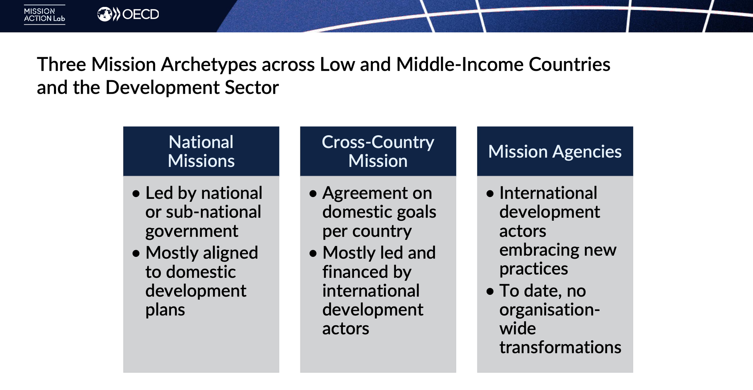 To support emerging and future mission-oriented innovation efforts along all archetypes, the OECD Mission Action Lab is currently finalizing a tool specifically for policy makers in the Global South, the Mission Readiness Assessment.
